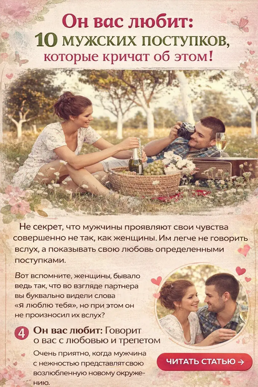 Он вас любит:10 мужских поступков, которые кричат об этом!Не секрет, что мужчины проявляют свои чувства совершенно не так, как женщины. Им легче не говорить вслух, а показывать свою любовь определенными поступками. Вот вспомните, женщины, бывало ведь так, что во взгляде партнера вы буквально видели слова “я люблю тебя”, но при этом он не произносил их вслух? Умение передавать свои чувства без слов — это искусство, которым владеют многие мужчины.