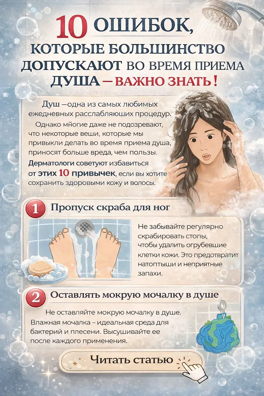 10 ошибок, которые большинство допускают во время приема душа — ВАЖНО ЗНАТЬ !.Душ – одна из самых любимых ежедневных расслабляющих процедур. Однако многие даже не подозревают, что некоторые вещи, которые мы привыкли делать во время приема душа, приносят больше вреда, чем пользы. Дерматологи советуют избавиться от этих 10 привычек, если вы хотите сохранить здоровыми кожу и волосы.