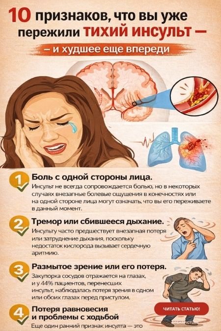 10 признаков, что вы уже пережили тихий инсульт — и худшее еще впереди.Берегите сосуды!″Тихие″ инсульты обычно проходят незамеченными.Последние исследования американских ученых показывают, что более 10% внешне здоровых людей перенесли «тихий» инсульт. И если они не примут меры, то могут готовиться к инсульту настоящему.