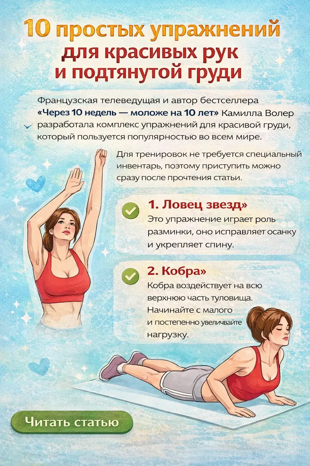 10 простых упражнений для красивых рук и подтянутой груди.Французская телеведущая и автор бестселлера «Через 10 недель — моложе на 10 лет» Камилла Волер разработала комплекс упражнений для красивой грyди, который пользуется популярностью во всем мире. Для тренировок не требуется специальный инвентарь, поэтому приступить можно сразу после прочтения статьи.