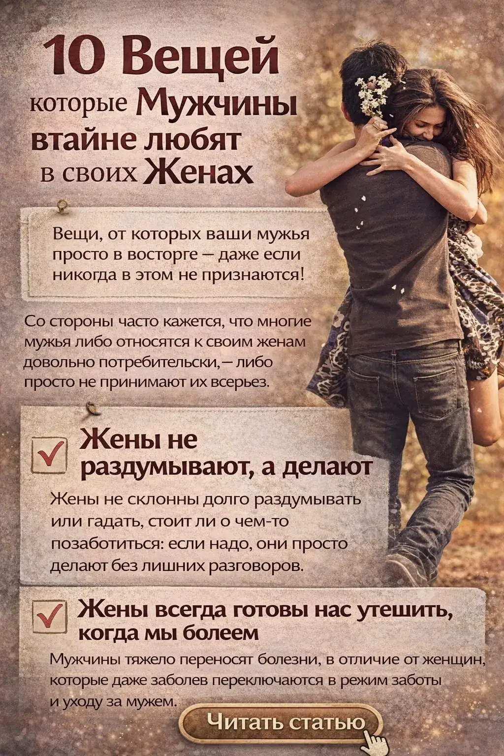 10 Вещей которые Мужчины втайне любят в своих Женах. Вещи, от которых ваши мужья просто в восторге — даже если никогда в этом не признаются! Со стороны часто кажется, что многие мужья либо относятся к своим женам довольно потребительски, либо просто не принимают их всерьез.