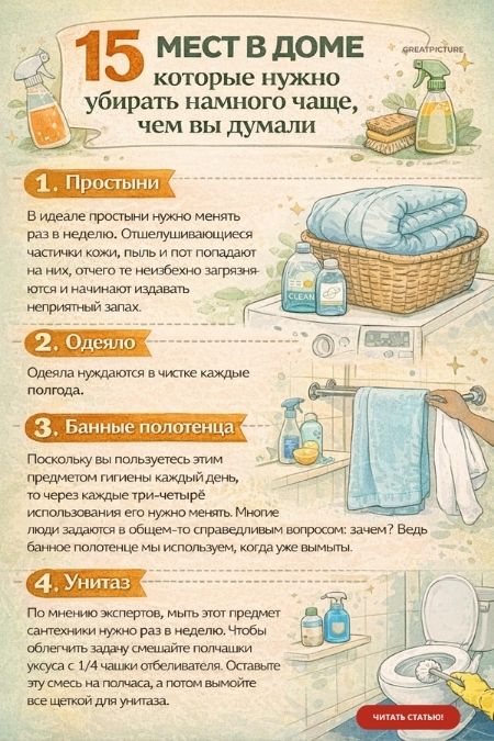 15 мест в дом, которые нужно убирать намного чаще, чем вы думали.Спасибо, полезная информация! №12 и №15 буду теперь убирать чаще!15 мест в доме которые нужно убирать намного чаще, чем вы думали.Уборка — важное и нужное дело. Правда, еще и трудоемкое. Особенно, если не убирать, не убирать, а потом раз и спохватиться — что же это я? Поэтому крайне полезно иметь собственный график уборки, который поможет сориентироваться в хозяйственных делах и ничего не упустить. Есть в доме вещи и места, знать “срок действия” чистоты которых просто необходимо. Вот они: