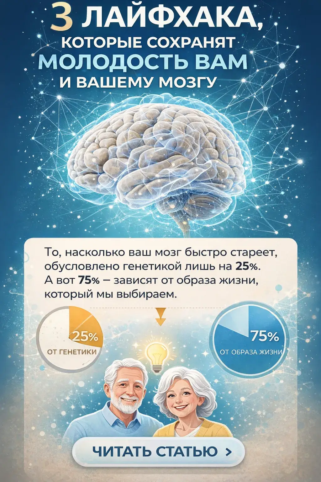 3 лайфхака, которые сохранят молодость вам и вашему мозгу. То, насколько ваш мозг быстро стареет, обусловлено генетикой лишь на 25%. А вот 75% – зависят от образа жизни, который мы выбираем. Кто из нас не мечтает сохранить ясность ума до глубоких седин? К сожалению, такая роскошь дарована природой немногим. Но недавнее исследование Mass General показало, что когда дело доходит до здоровья мозга, то некоторым людям каким-то удивительным образом удаётся поддерживать его в форме намного лучше, чем другим. Этим «супер-агентам» – от 60 до 70 лет, но они выполняют тесты на память точно так же, как и 20-летние. Чем можно объяснить такие уникальные способности и можно ли развить их каждому человеку? Оказывается, что всё – в наших руках.