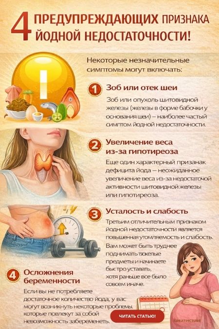 Низкий уровень йода у беременных также может привести к проблемам развития ребенка, таким как умственная отсталость и замедление роста. Если вы беременны, вскармливаете ребенка или пытаетесь забеременеть, вам особенно важно убедиться, что вы потребляете достаточное количество йода с пищей или добавками.