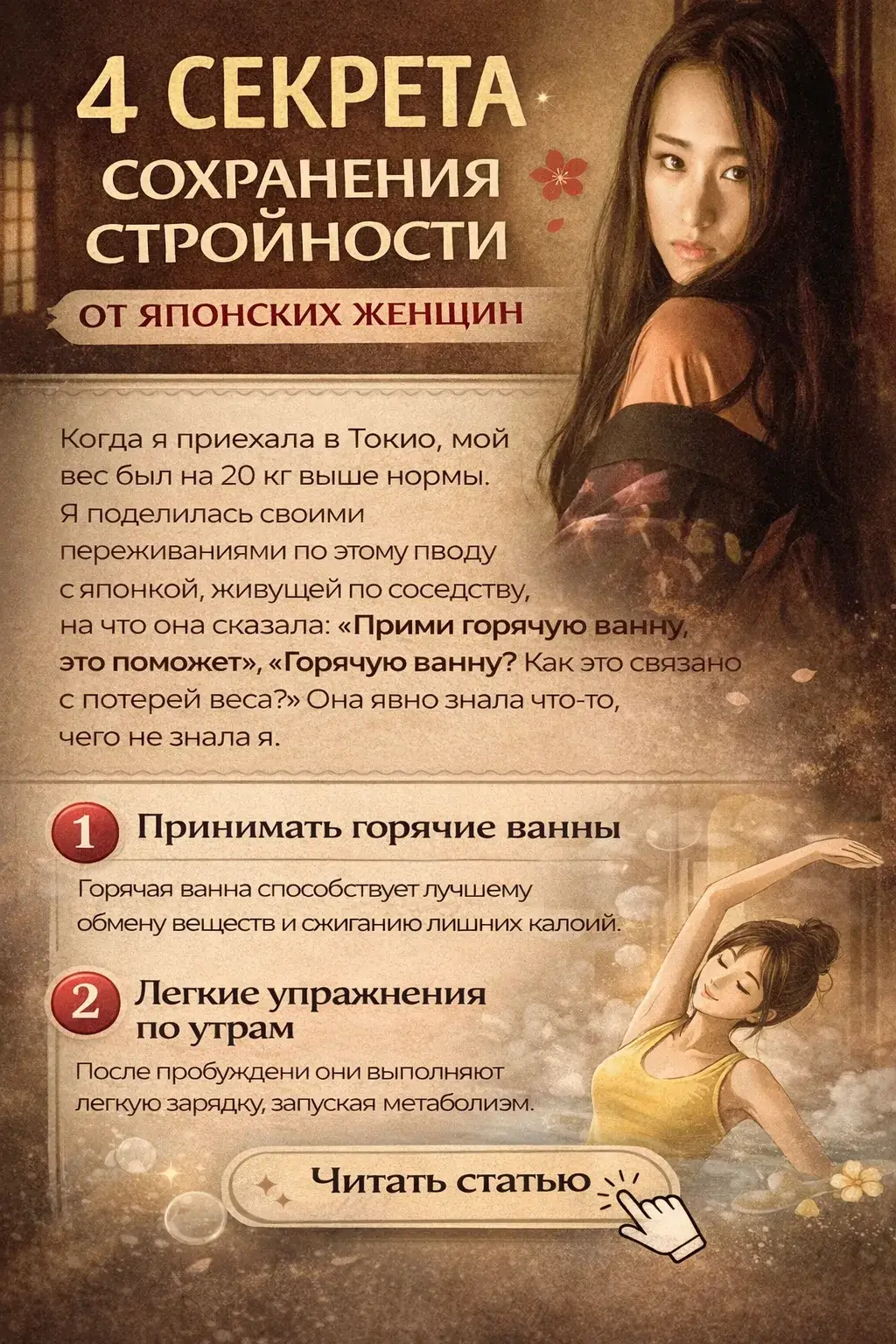 4 секрета сохранения стройности от японских женщин.Когда я приехала в Токио, мой вес был на 20 кг выше нормы. Я поделилась своими переживаниями по этому поводу с японкой, живущей по соседству, на что она сказала: «Прими горячую ванну, это поможет». «Горячую ванну? Как это связано с потерей веса?» Она явно знала что-то, чего не знала я.