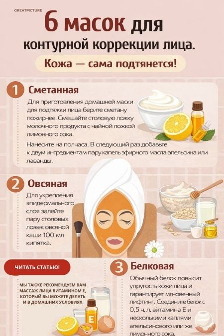 6 масок для контурной коррекции лица. Кожа — сама подтянется! Нам не избежать возрастных изменений. Да, старение можно замедлить, но точно не оттянуть на лет 15 или вообще остановить. Говорят, в любом возрасте нужно уметь принимать себя как есть. Но это вовсе не значит, что стоит опустить руки. Мы очень рекомендуем вам массаж лица витамином Е, который вы можете делать и в домашних условиях, а также маски для подтяжки лица.