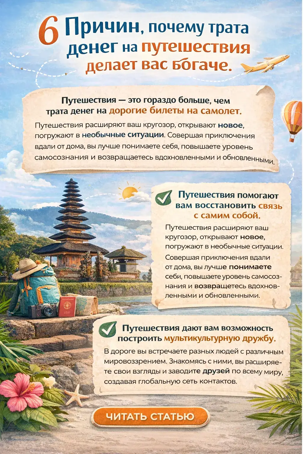 6 Причины, почему трата денег на путешествия делает вас богаче.Путешествия — это гораздо больше, чем трата денег на дорогие билеты на самолет.Путешествия — одна из самых невероятных вещей, которые мы можем сделать в этом мире. Оно заставляет нас осознать, что сколько бы мы ни думали, что знаем, всегда есть что-то еще, что можно увидеть, исследовать и узнать.