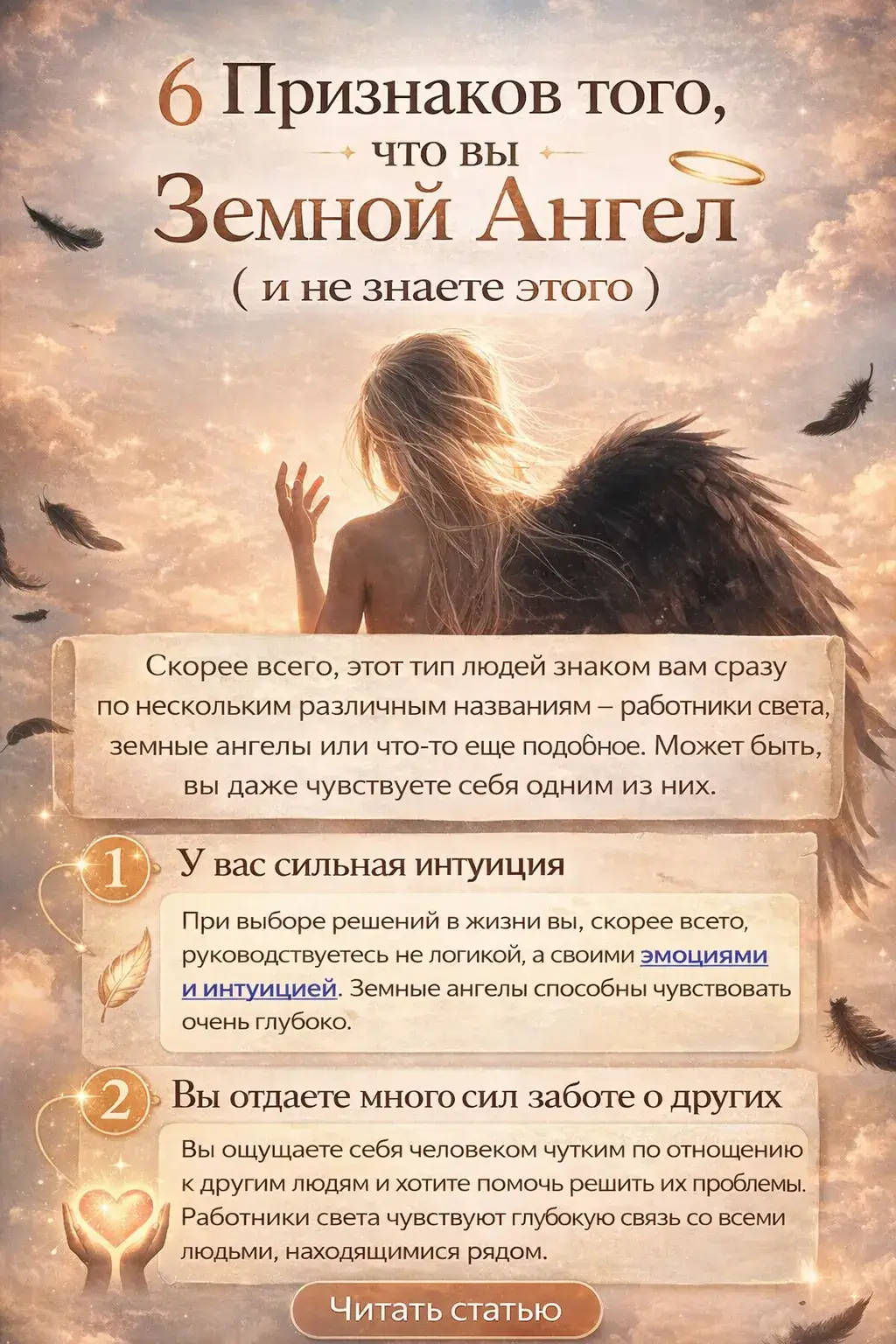 6 признаков того что вы Земной Ангел (и не знаете этого).Скорее всего, этот тип людей знаком вам сразу по нескольким различным названиям – работники света, земные ангелы или что-то еще подобное. Может быть, вы даже чувствуете себя одним из них.Работники света пришли в этот мир, чтобы поделиться своим светом, насколько это возможно, и принести позитивные перемены на эту планету. Они никогда не смогут принять и смириться с ненавистью, нетерпимостью, насилием, различным формам угнетения.