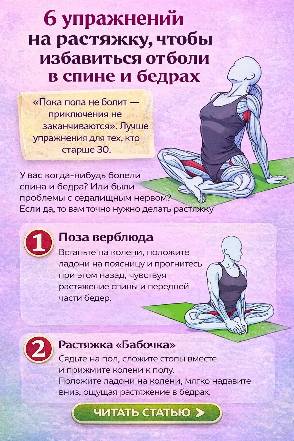 6 упражнений на растяжку, чтобы избавиться от боли в спине и бедрах.»Пока попа не болит — приключения не заканчиваются»