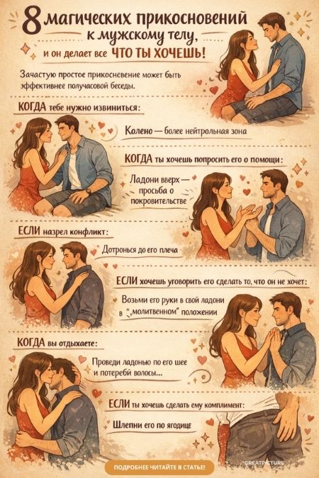 8 магических прикосновений к мужскому телу, и он делает все ЧТО ТЫ ХОЧЕШЬ!Тактильный контакт с мужчиной — надежный способ добиться своего, когда тебе нужно извиниться или попросить его помощи.Многочисленные исследования подтверждают, что жесты могут выражать множество эмоций — любовь или гнев, сочувствие или одобрение.