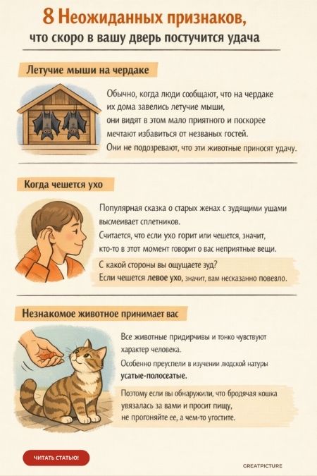 Обычно, когда люди сообщают, что на чердаке их дома завелись летучие мыши, они видят в этом мало приятного и поскорее мечтают избавиться от незваных гостей. Они не подозревают, что эти животные приносят удачу. На самом деле, если летучие мыши решили поселиться внутри вашего жилища — это хороший знак. Они облюбовали это место из-за хорошей, положительной энергии. А это значит, ни счастье, ни здоровье также не посмеют обойти ваш дом стороной.