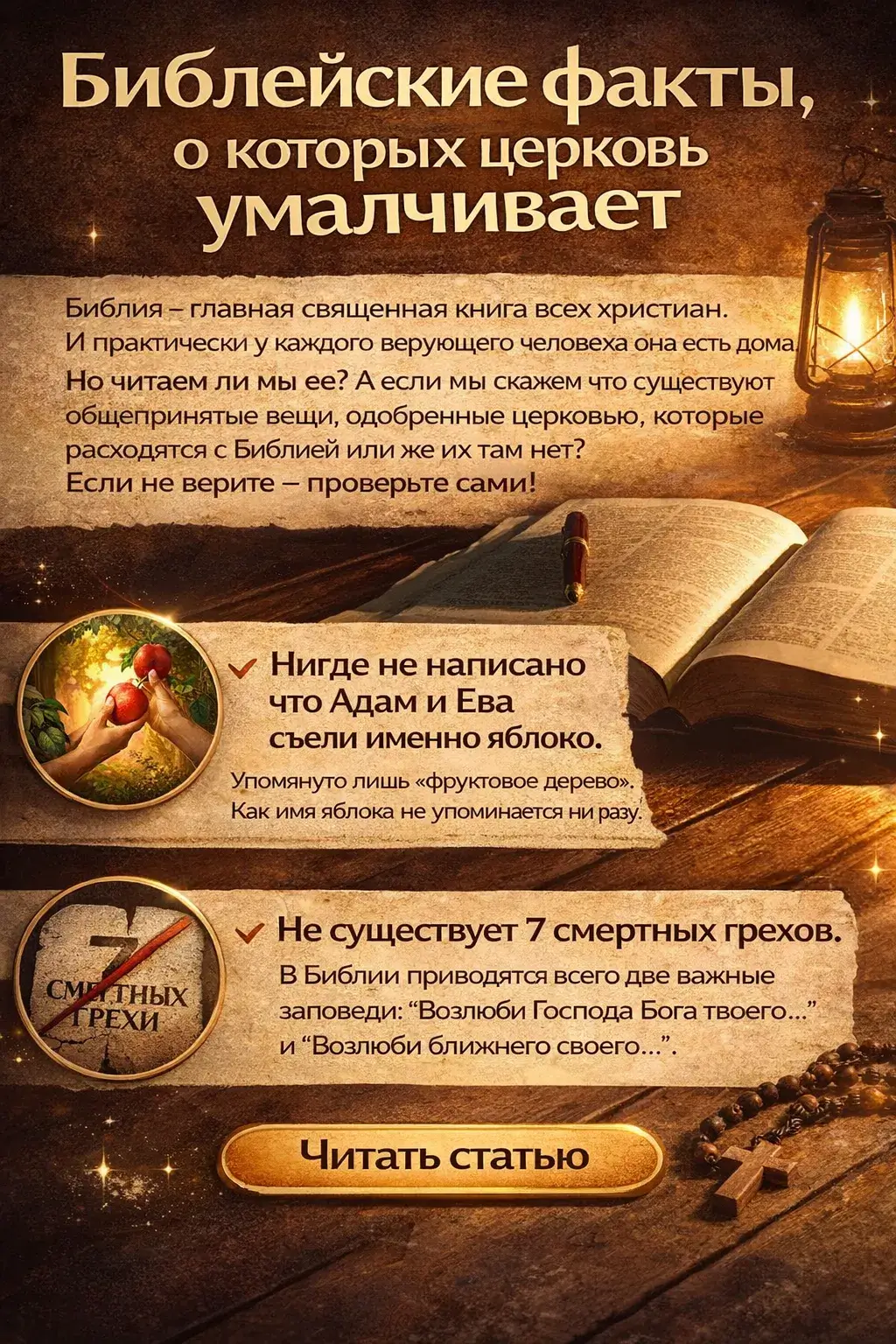 Библейские факты, о которых церковь умалчивает. Библия – главная священная книга всех христиан. И практически у каждого верующего человека она есть дома. Но читаем ли мы ее? А если мы скажем что существуют общепринятые вещи, одобренные церковью, которые расходятся с Библией или же их там нет? Если не верите – проверьте сами!