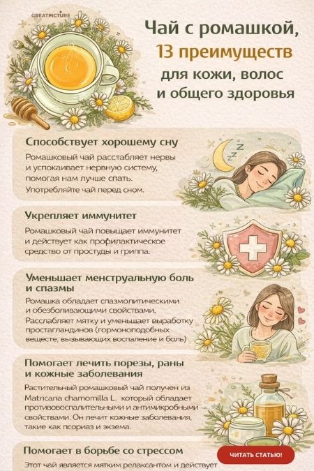 Чай с ромашкой,13 преимуществ для кожи, волос и общего здоровья.Многие преимущества ромашкового чая до сих пор неизвестны большинству.Когда мы думаем о чае из ромашки, мы сразу же ассоциируем напиток с ощущением спокойствия и умиротворения.