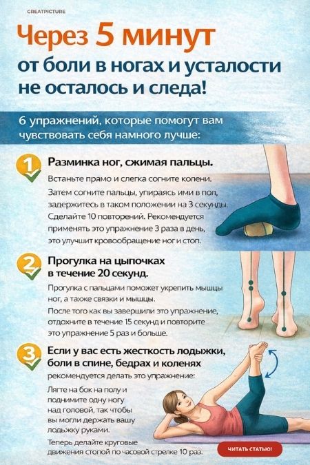 Через 5 минут от боли в ногах и усталости не осталось и следа! Вы почувствуете результаты уже после первого занятия! Это так здорово, попробуйте!Ноги очень важны для нашей жизни. Часто мы забываем заботиться об их здоровье. Но они способствуют здоровью различных частей тела.