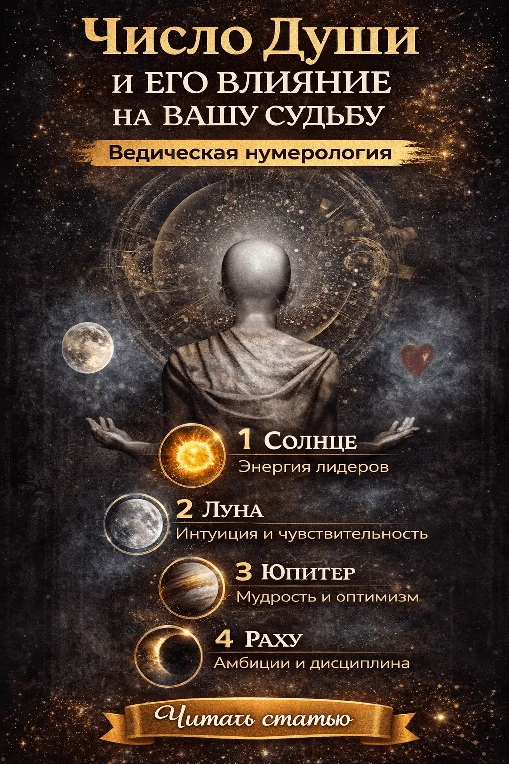 Ведическая нумерология считает, что человеку присущи три основных числа: Души, Судьбы и Имени. Число Души – это день вашего рождения. Считается что цифра жизни человека сложенная из двух чисел, несeт в себе и их влияние тоже.