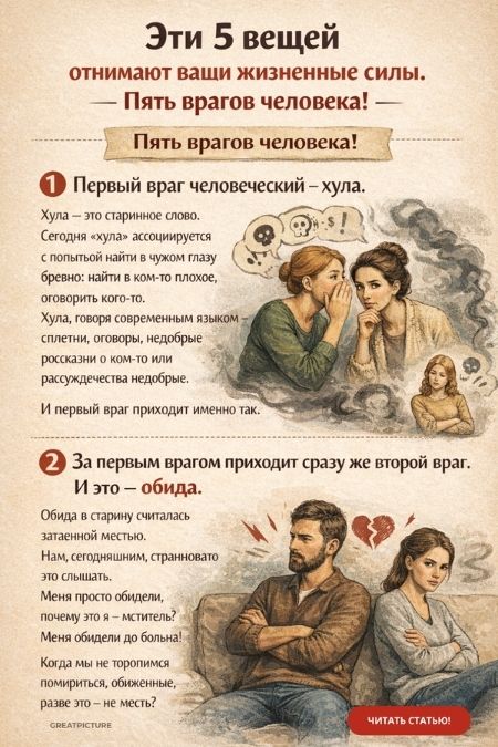 Эти 5 вещей отнимают ваши жизненные силы.У человека есть пять врагов, и эти враги приходят по очереди.Эти 5 вещей отнимают ваши жизненные силы.5 врагов человеческих по древнему трактату 8-10 в.в. Принято считать, что в наше время жить надо по другим правилам, нежели раньше. Через мои руки прошло очень много старинных древних документов. Сейчас расскажу вам об одном из них. Трактат древнейший, период — начало христианизации Руси. На документе было проставлено 8-10 в.в., но предположительно, т.к., документ переписывался несколько раз.