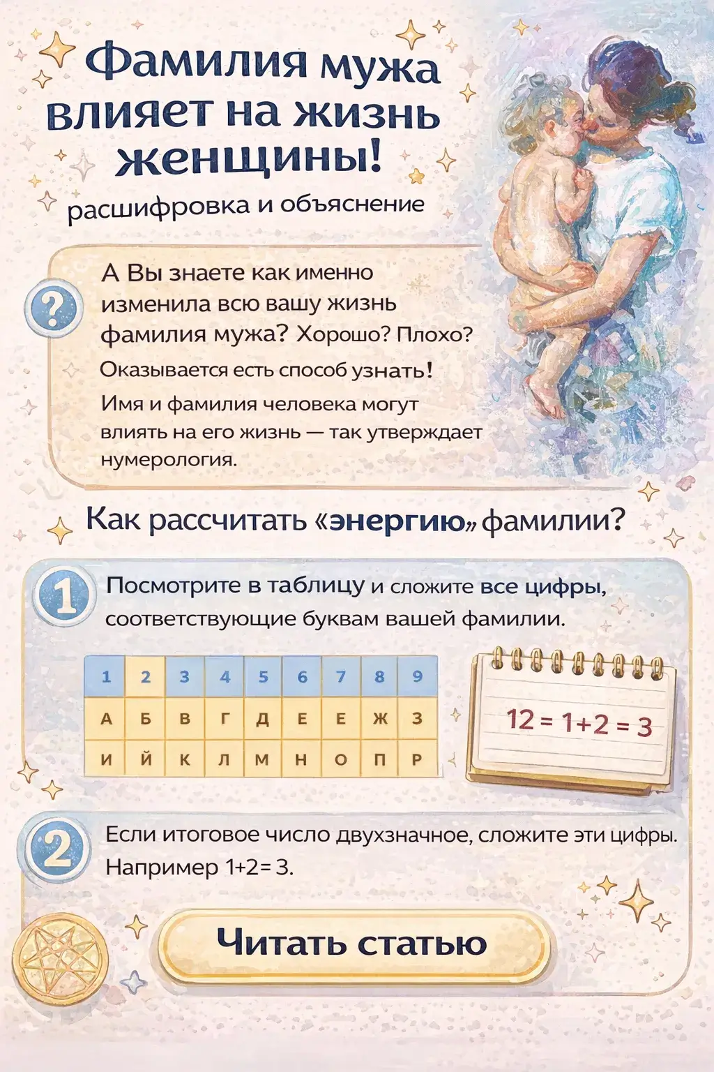 Фамилия мужа влияет на жизнь женщины, расшифровка и объяснение. А Вы знаете как именно изменила всю вашу жизнь фамилия мужа? Хорошо? Плохо? Оказывается есть способ узнать! Имя и фамилия человека могут влиять на его жизнь — так утверждает нумерология. Фамилия, которая дана вам от рождения, всегда оказывает свое действие на ваш характер. А вот если вы после брака берете другую фамилию, кое-что в вашей жизни может измениться.