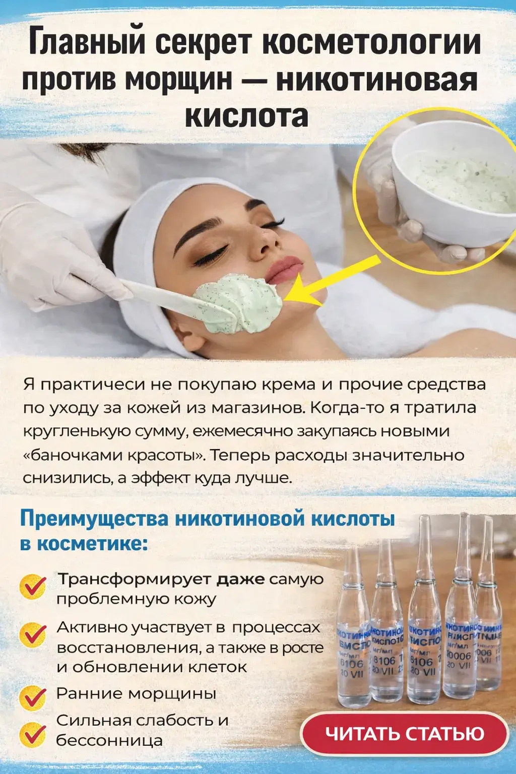 Главный секрет косметологии против морщин — никотиновая кислота.Я практически не покупаю крема и прочие средства по уходу за кожей из магазинов. Когда-то я тратила кругленькую сумму, ежемесячно закупаясь новыми «баночками красоты». Теперь расходы значительно снизились, а эффект куда лучше.