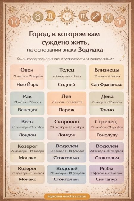 Астрологи сравнили гороскоп человека с гороскопом местоположения города или страны, интерпретируя планетарные взаимодействия и обнаружили, какой город подходит вам, в зависимости от вашего знака Зодиака:
