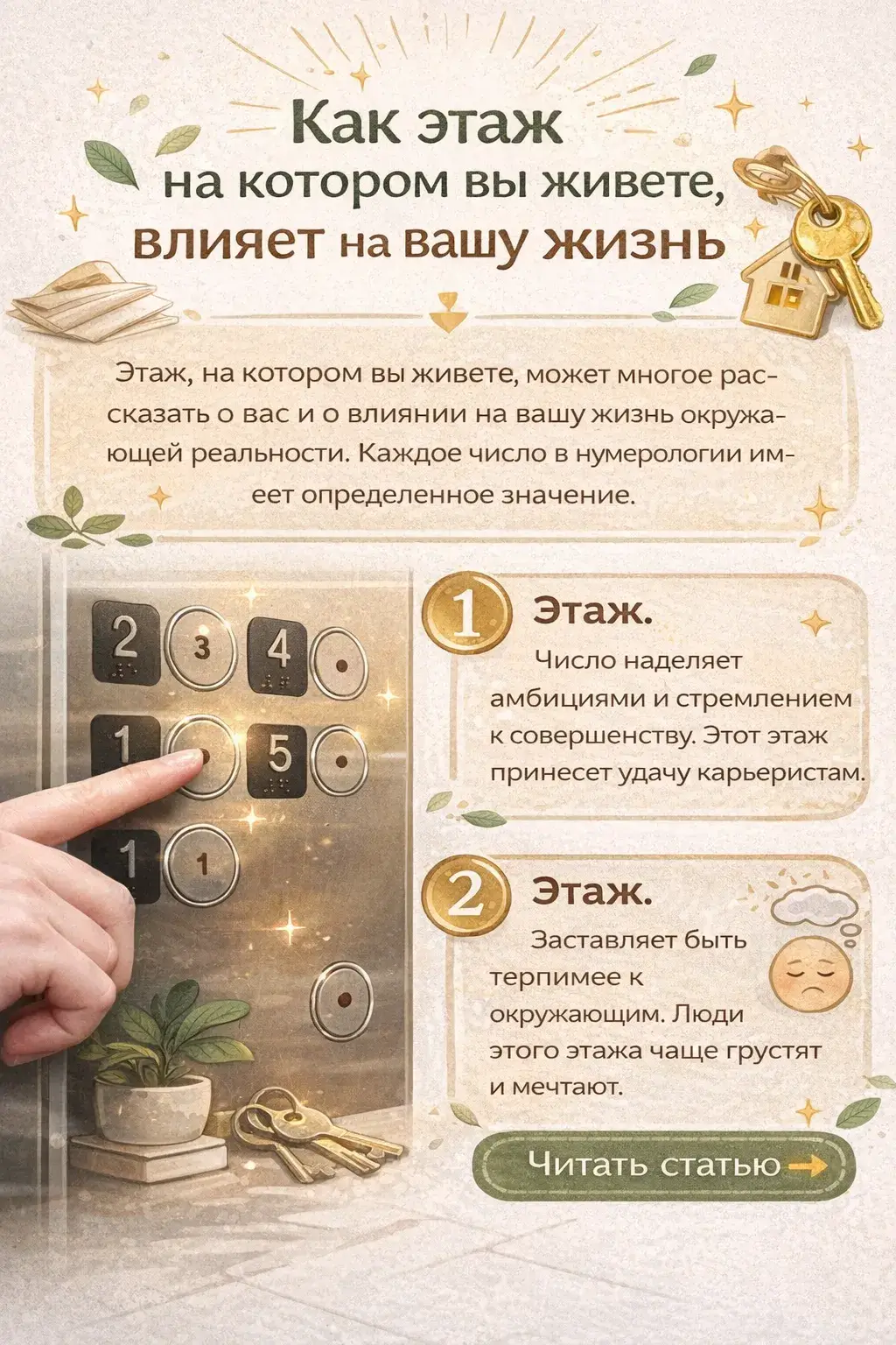 Как этаж на котором вы живете, влияет на вашу жизнь. Этаж, на котором вы живете, может многое рассказать о вас и о влиянии на вашу жизнь окружающей реальности. Каждое число в нумерологии имеет определенное значение. На основе этой древней эзотерической науки можно узнать о влиянии чисел на жизнь человека. И поскольку числа нас окружают повсюду, то с помощью нумерологических знаний можно легко высчитать их воздействие.