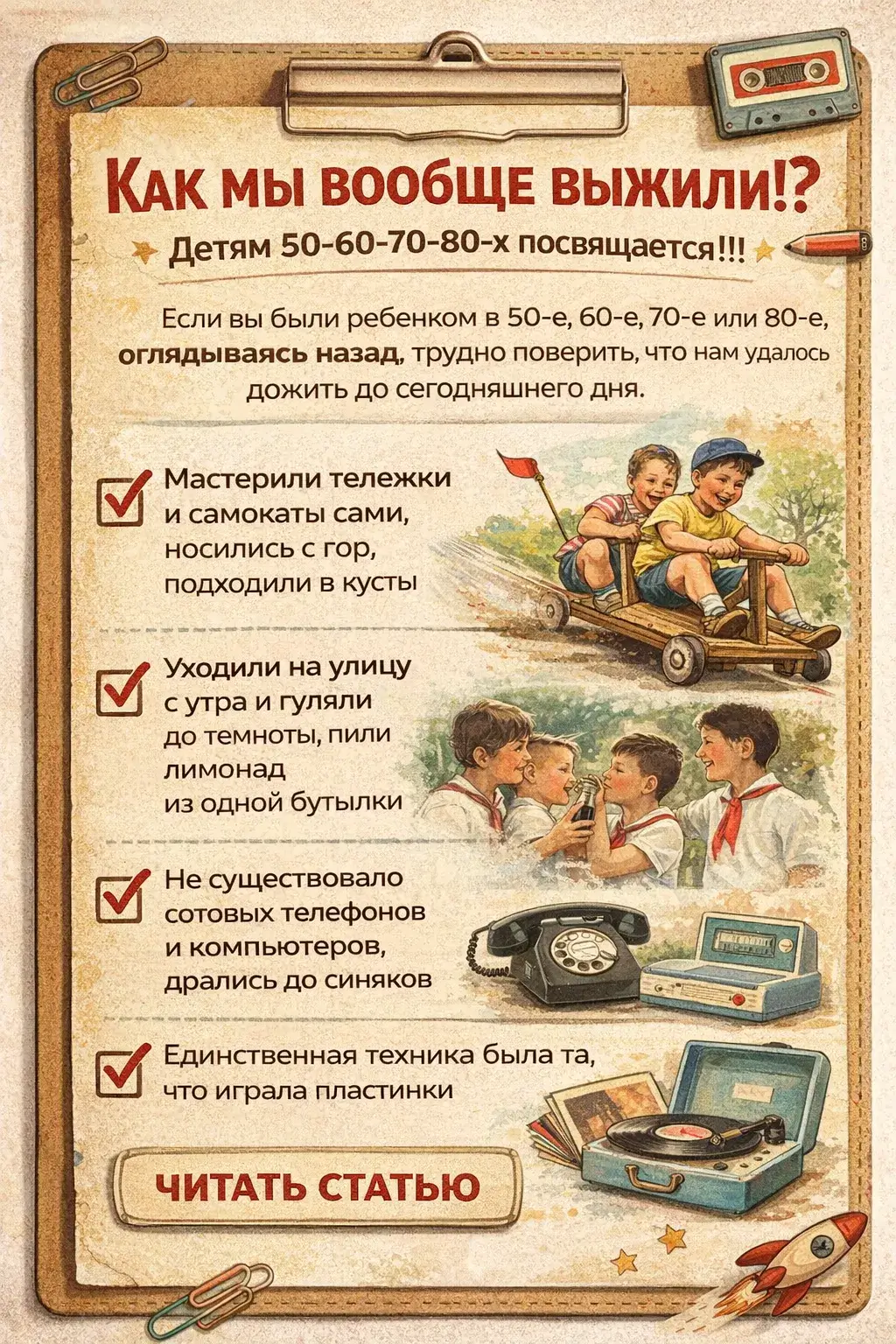 Как мы вообще выжили!? Детям 50-60-70-80-х посвящается!!!Если вы были ребенком в 50-е, 60-е, 70-е или 80-е, оглядываясь назад, трудно поверить, что нам удалось дожить до сегодняшнего дня. В детстве мы ездили на машинах без ремней и подушек безопасности. Поездка на телеге, запряженной лошадью, в теплый летний день была несказанным удовольствием. Наши кроватки были раскрашены яркими красками с высоким содержанием свинца. Как мы вообще выжили!? Не было секретных крышек на пузырьках с лекарствами, двери часто не запирались, а шкафы не запирались никогда. Мы пили воду из колонки на углу, а не из пластиковых бутылок. Никому не могло придти в голову кататься на велике в шлеме. Ужас!