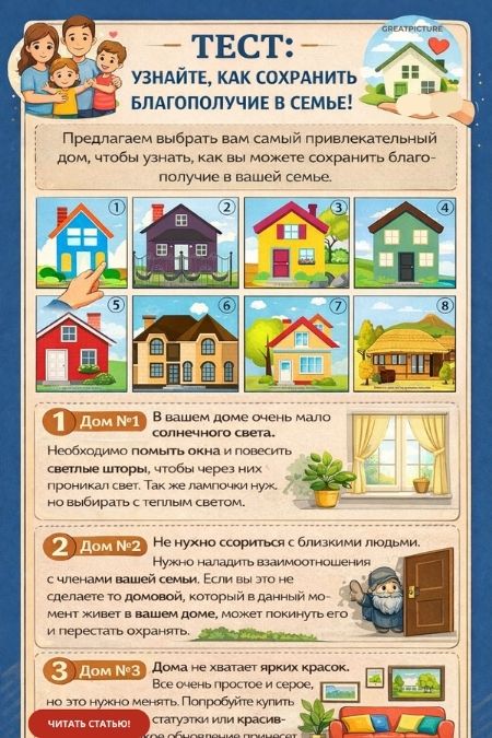 Предлагаем выбрать вам самый привлекательный дом, чтобы узнать, как вы можете сохранить благополучие в вашей семье.