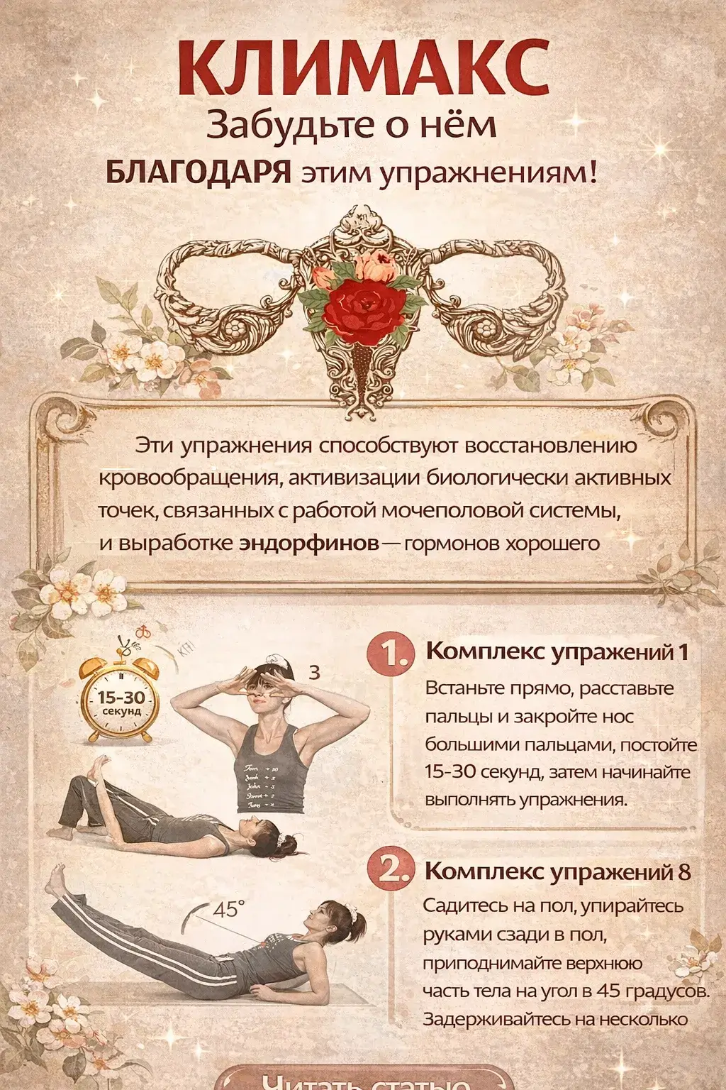 Эти упражнения способствуют восстановлению кровообращения, активизации биологически активных точек, связанных с работой мочеполовой системы, и выработке эндорфинов – гормонов хорошего настроения. Забудьте, что такое климакс благодаря этим упражнениям!