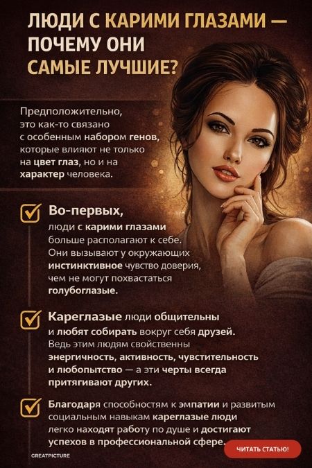 Исследования показали, что кареглазые люди обладают уникальными чертами характера. Предположительно, это как-то связано с особенным набором генов, которые влияют не только на цвет глаз, но и на характер человека.