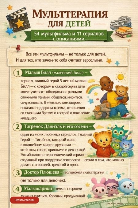 Мульттерапия для детей: 54 мультфильма и 11 сериалов с описаниями.Зная любимый мультфильм ребёнка, любимого героя ребенка — ты понимаешь, в каком процессе он сейчас живет. И как ты можешь его сопровождать, если это нужно, предлагая посмотреть или поиграть в «мультфильм».
