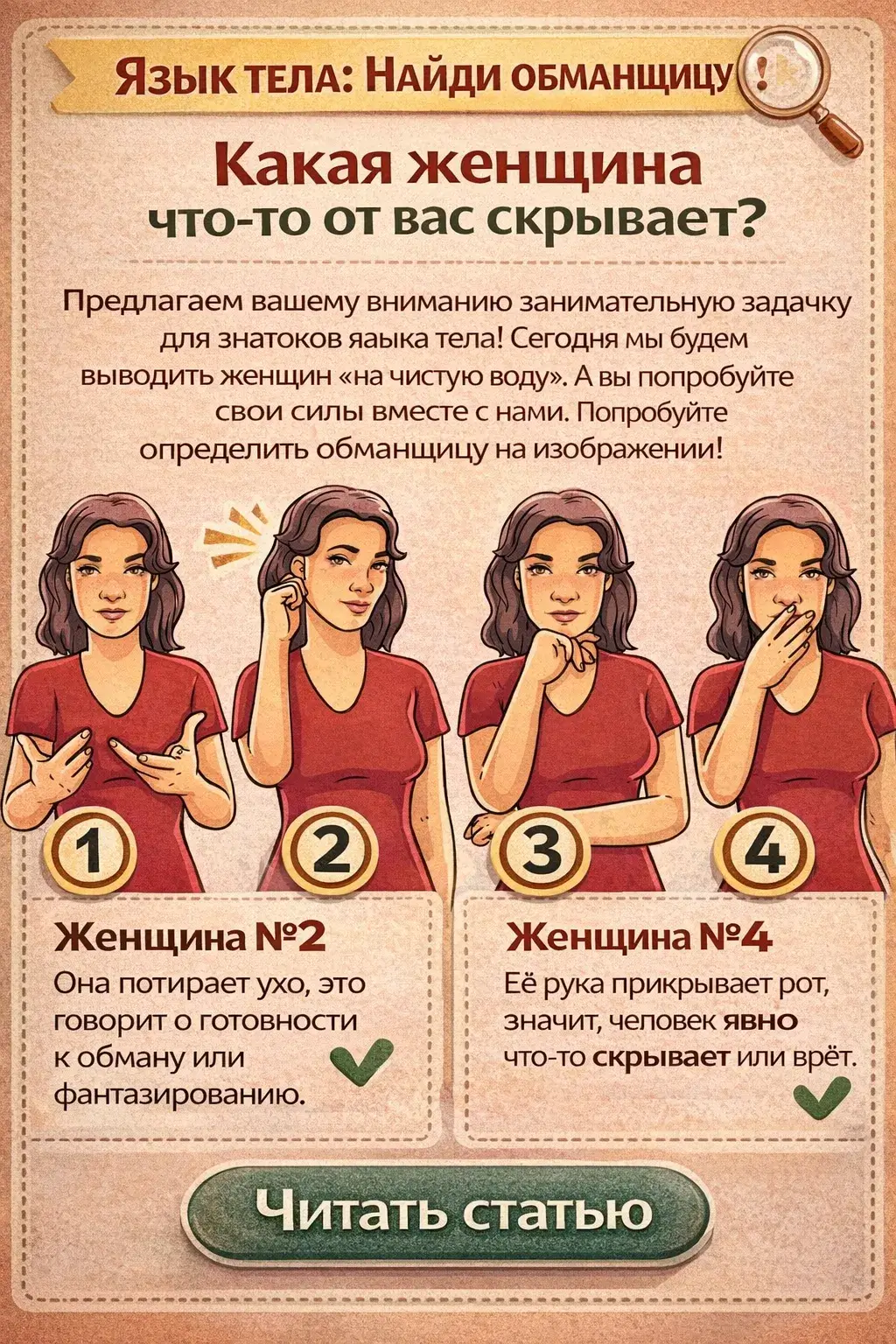 Язык тела: Найди обманщицу! Какая женщина что-то от вас скрывает? Проверьте, насколько вы проницательны!