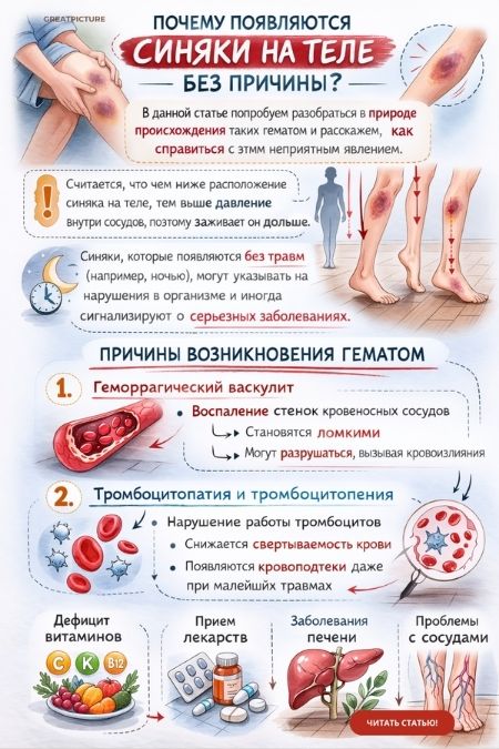 В некоторых случаях синяки появляются на теле без причин после недавно перенесенного инфекционного заболевания. Точную причину образования гематом на теле выявит квалифицированный врач, проведя тщательное обследование; лечение данного недуга строго индивидуальное.