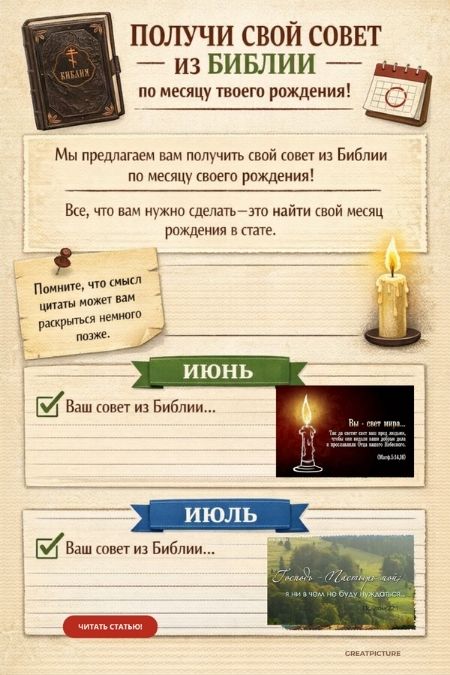 ПОЛУЧИ СВОЙ СОВЕТ ИЗ БИБЛИИ по месяцу твоего рождения!Господи, благодарю тебя за все!Несомненно, Библия-священная книга. Я не знаю книги мудрее этой. Признаюсь честно, читаю сама не часто…Но иногда открываю ее в случайном месте и то, что открыла всегда в тему и в мою жизненную ситуацию попадает… Как так получается? Не знаю…Но я верю, что это не случайно! Сегодня мы предлагаем вам сделать практически тоже самое.