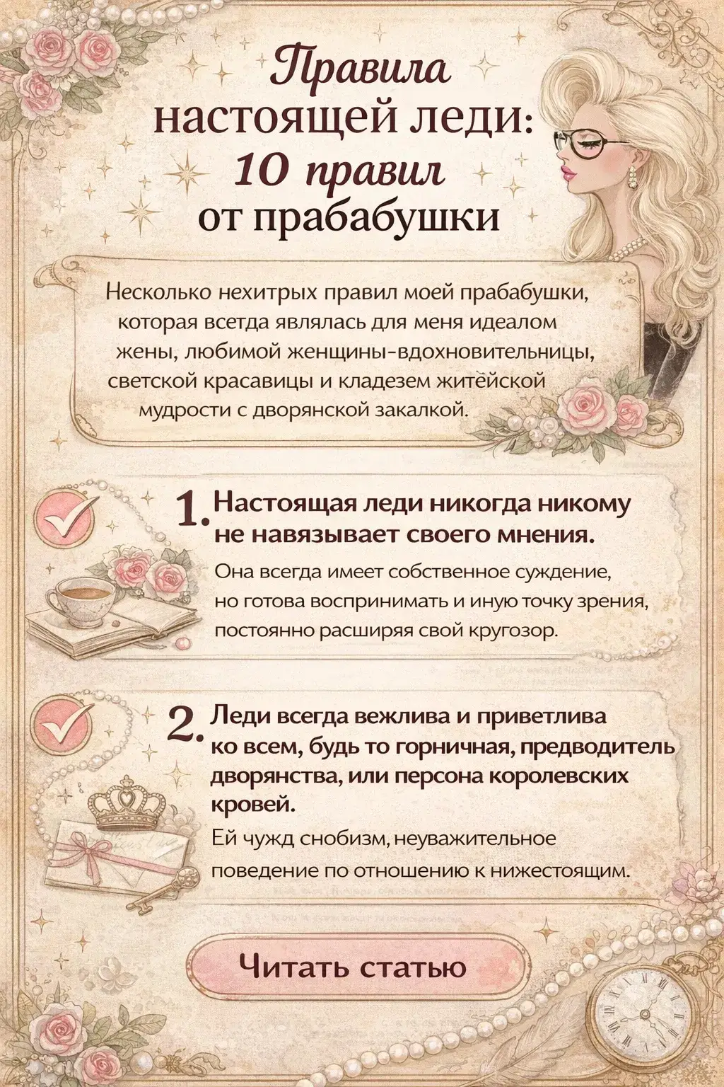 Правила настоящей леди: 10 правил от прабабушки. Несколько нехитрых правил моей прабабушки, которая всегда являлась для меня идеалом жены, любимой женщины-вдохновительницы, светской красавицы и кладезем житейской мудрости с дворянской закалкой.