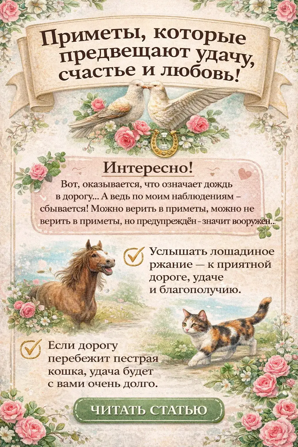 В целом Приметы, которые предвещают удачу, счастье и любовь помогут вам сохранять хорошее расположение духа и всегда знать, чего ожидать от жизни хорошего.