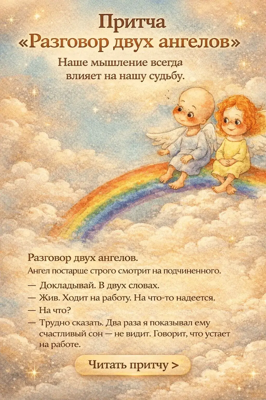 Притча «Разговор двух ангелов» — Наше мышление всегда влияет на нашу судьбу. Наше мышление всегда влияет на нашу судьбу. Как бы мы не хотели не верить в это, но если мы думаем, что все плохо, то так оно и будет, потому что Вселенная всегда исполняет наши желания и мысли. Любая мысль — это энергетический посыл во Вселенную. Эта притча покажет нам как важно уметь ценить то, что у нас есть, и использовать все наши возможности.
