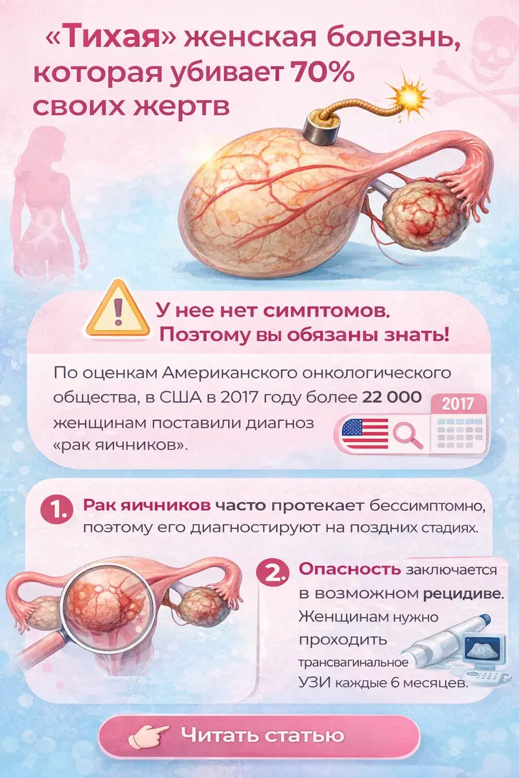 ″Тихая″ женская болезнь, которая убивает 70% своих жертв.У нее нет симптомов. Поэтому вы обязаны знать!По оценкам Американского онкологического общества, в США в 2017 году более 22 000 женщинам поставили диагноз «рак яичников».