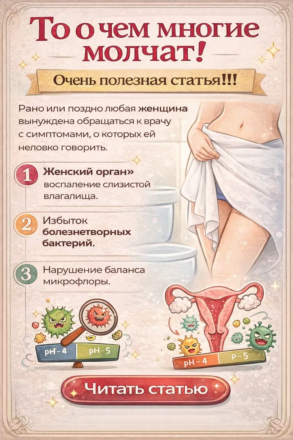 То о чем многие молчат: Женский орган — воспаление слизистой влагалища, спровоцированное болезнетворными бактериями или грибками. По статистике, им страдает каждая 3-я женщина детородного возраста.