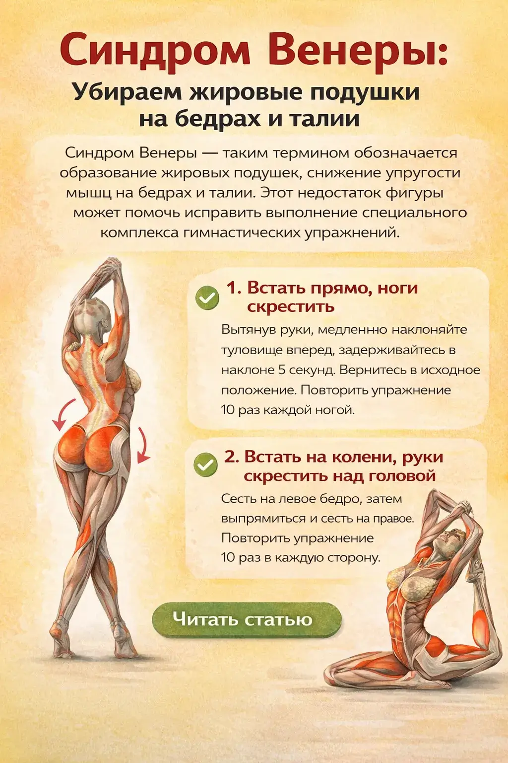 Синдром Венеры — таким термином обозначается образование жировых подушек, снижение упругости мышц на бедрах и талии. Этот недостаток фигуры может помочь исправить выполнение специального комплекса гимнастических упражнений.