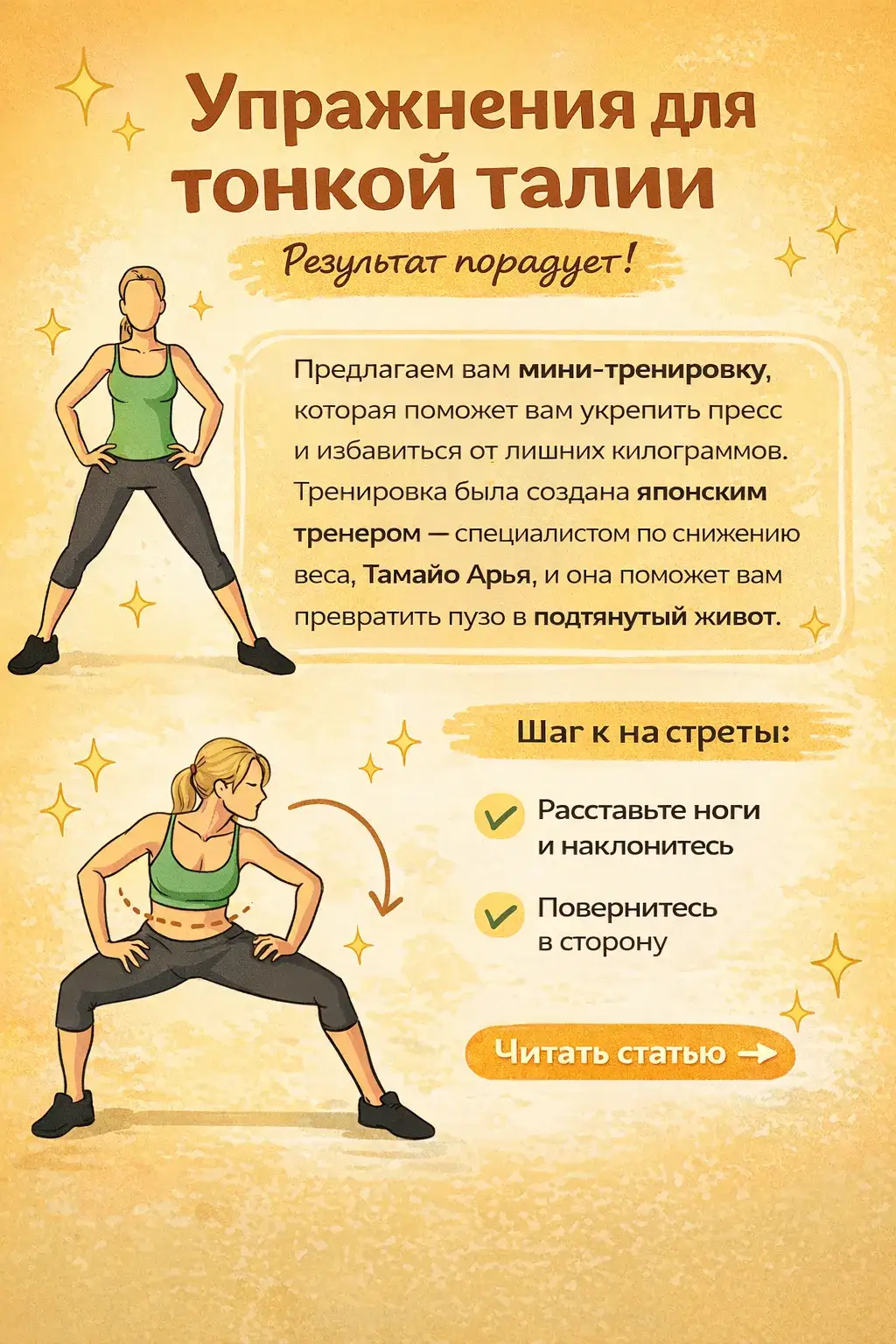 Упражнение для тонкой талии:Предлагаем ваммини-тренировку, которая поможет вам укрепить пресс и избавиться от лишних килограммов. Тренировка была создана японским тренером — специалистом по снижению веса, Тамайо Арья, и она поможет вам превратить пузо в подтянутый живот.