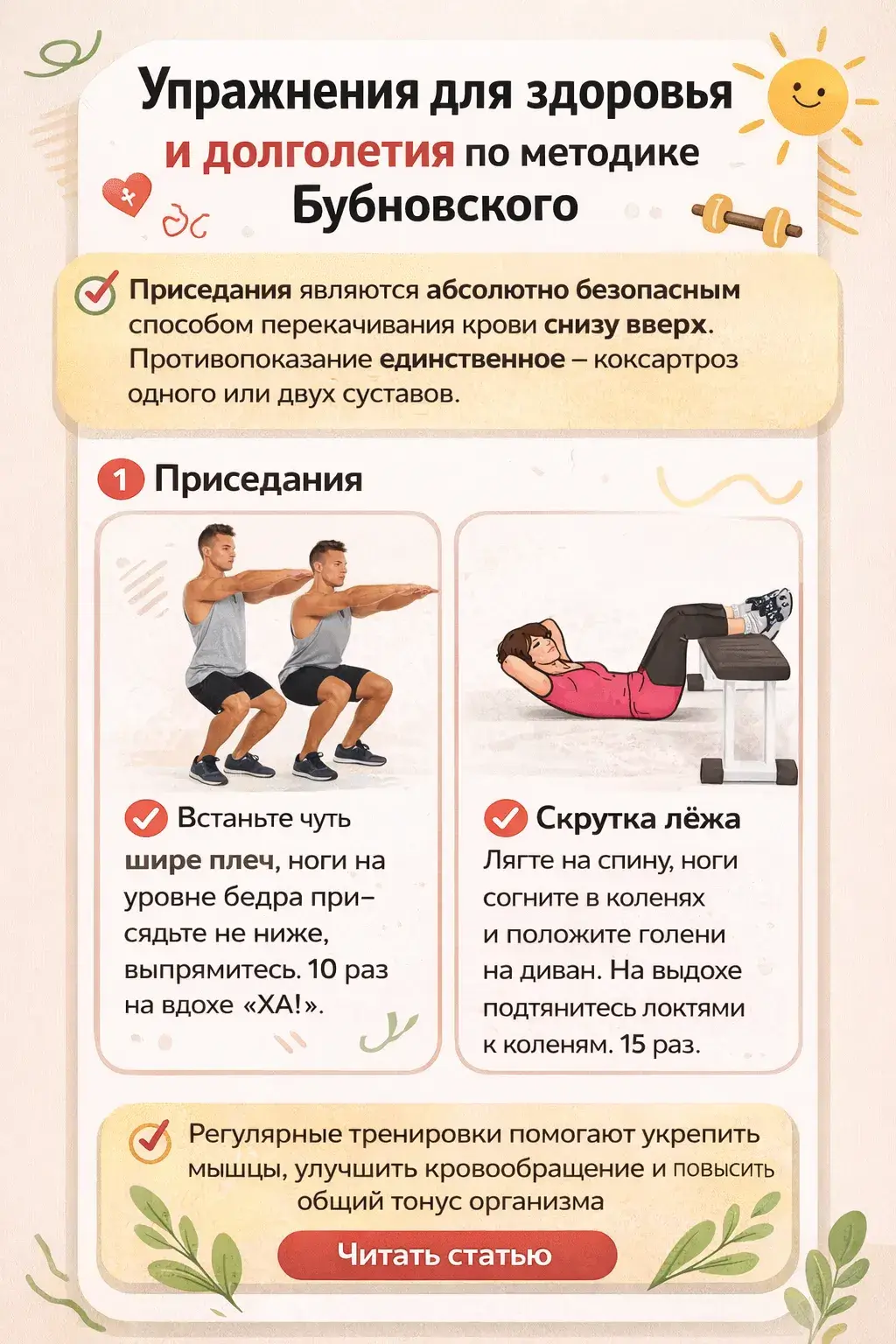 Упражнения для здоровья и долголетия по методике Бубноского.Приседания являются абсолютно безопасным способом перекачивания крови снизу вверх.Противопоказание единственное — коксартроз одного или двух суставов. Коксартроз (деформирующий артроз) – это дегенеративно – дистрофическое заболевание тазобедренного сустава, в основе которого лежит поражение хряща, а также костные разрастания по краю сустава и кистозное разрежение ткани сустава.