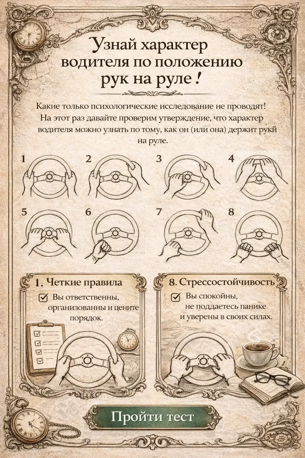 Узнай характер водителя по положению рук на руле!Какие только психологические исследование не проводят! На этот раз давайте проверим утверждение что характер водителя можно узнать по тому, как он (или она) держит руки на руле.