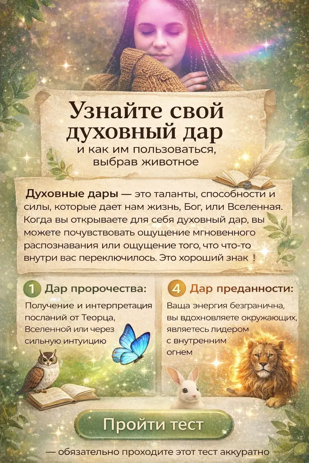 Узнайте свой духовный дар и как им пользоваться: Наша команда подготовила следующий тест, который поможет вам определить какой у вас есть дар. В этот тест включены восемь возможных духовных даров, каждый из которых предоставит вам соответствующий духовный архетип. Какие из этих красивых животных привлекают вас больше всего? Ваш выбор даст вам ответ, в чем ваш духовный дар.