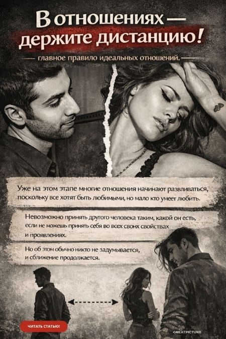 В отношениях — держите дистанцию! — главное правило идеальных отношений.Это самое главное правило, из которого вытекают все остальные. Когда мужчина и женщина вступают в новые отношения, они друг для друга неизведанная территория. Они заново открывают друг друга и радуются каждому шагу, сделанному навстречу. Более того, в конечном счете они стремятся стать одним нераздельным целым — именно это часто считается воплощением идеала любовных отношений.