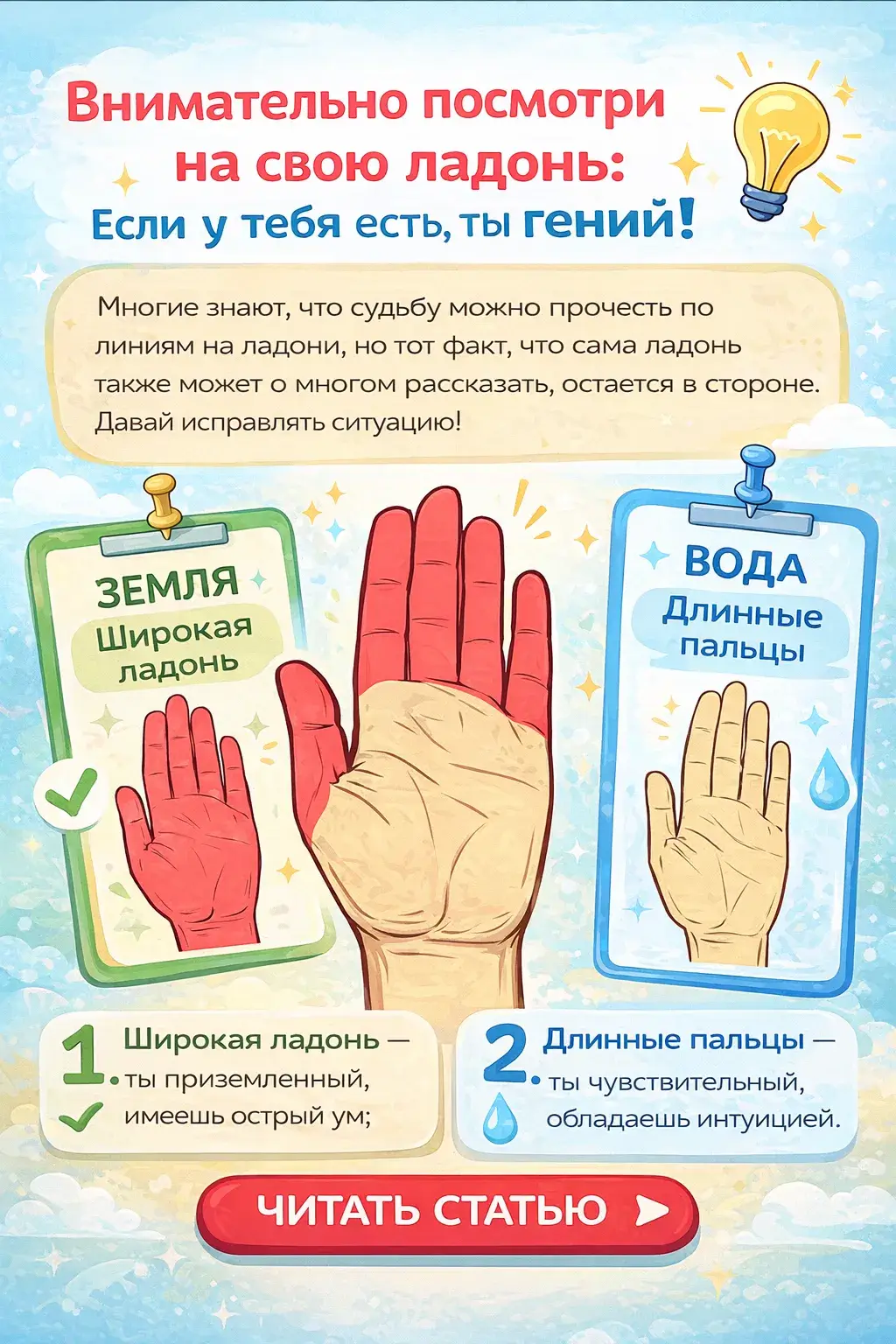 Внимательно посмотри на свою ладонь. Если у тебя есть ЭТО, ты настоящий гений! Сегодня хиромантия находится на пике популярности и активно используется людьми. Многие знают, что судьбу можно прочесть по линиям на ладони, но тот факт, что сама ладонь также может о многом рассказать, остается в стороне. Давай исправлять ситуацию!