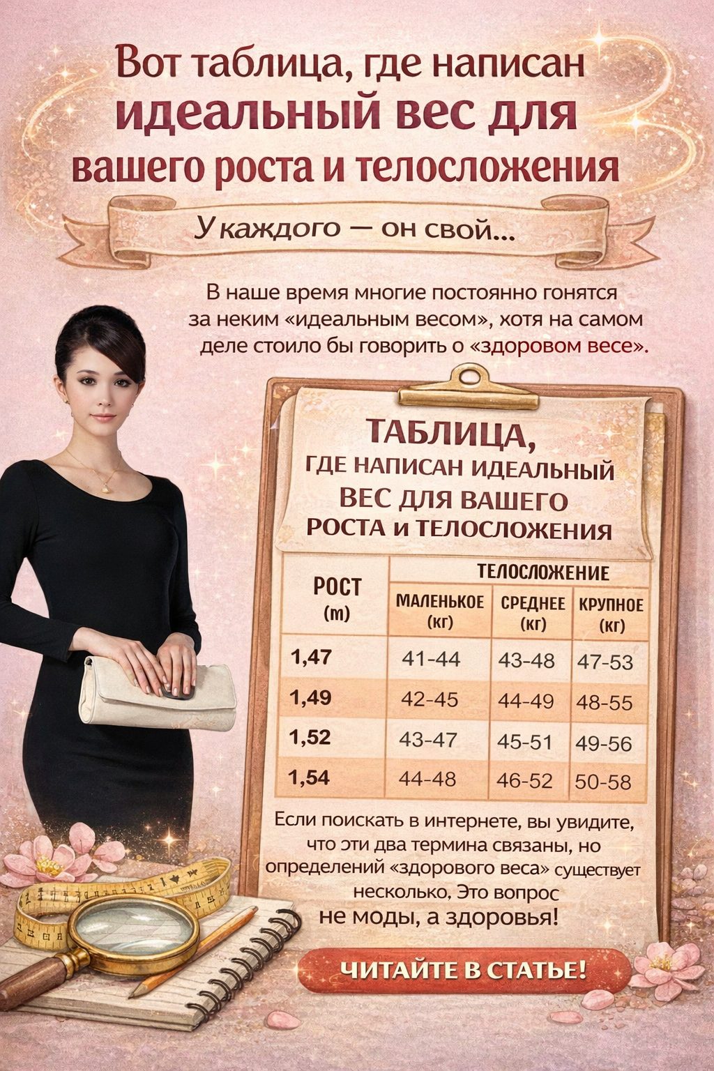 Вот таблица где написан идеальный вес для вашего роста и телосложения.У каждого — он свой… В наше время многие постоянно гонятся за неким «идеальным весом», хотя на самом деле стоило бы говорить о «здоровом весе».