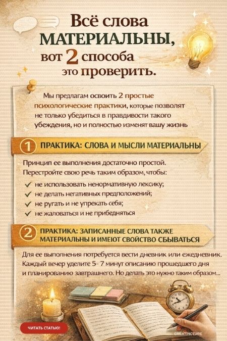 Прежде чем приступить к практическим занятиям, давайте разберемся в теории. Под «материальностью» слов подразумевается тот факт, что все озвученные вами предположения и сделанные прогнозы имеют свойство рано или поздно сбываться.