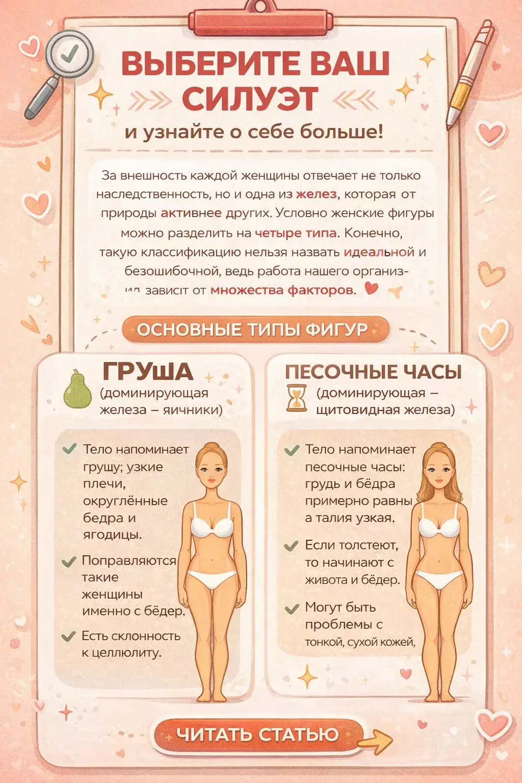 Выберите ваш силуэт и узнайте о себе больше. Вот о чем говорит ваш тип фигуры. За внешность каждой женщины отвечает не только наследственность, но и одна из желез, которая от природы активнее других. Условно женские фигуры можно разделить на четыре типа. Конечно, такую классификацию нельзя назвать идеальной и безошибочной, ведь работа нашего организма зависит от множества факторов.