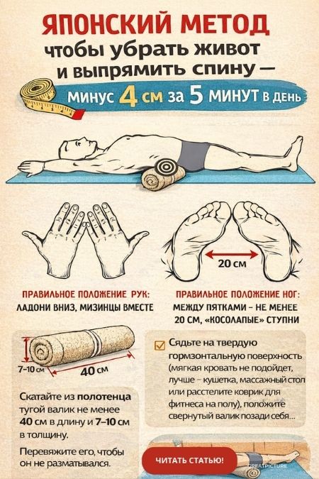 Всего пять минут в день для занятий, и очертания вашего тела ощутимо изменятся, талия станет тоньше, а спина – ровнее. Японский метод чтобы убрать живот.