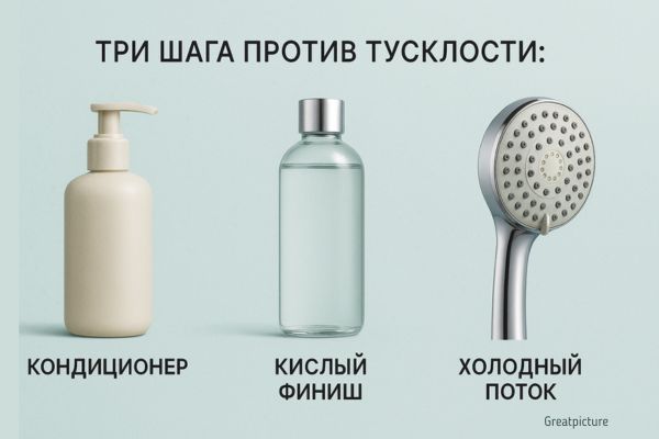 Пн — Мягкий шампунь → кондиционер → кислый спрей (коротко) → холодный поток.